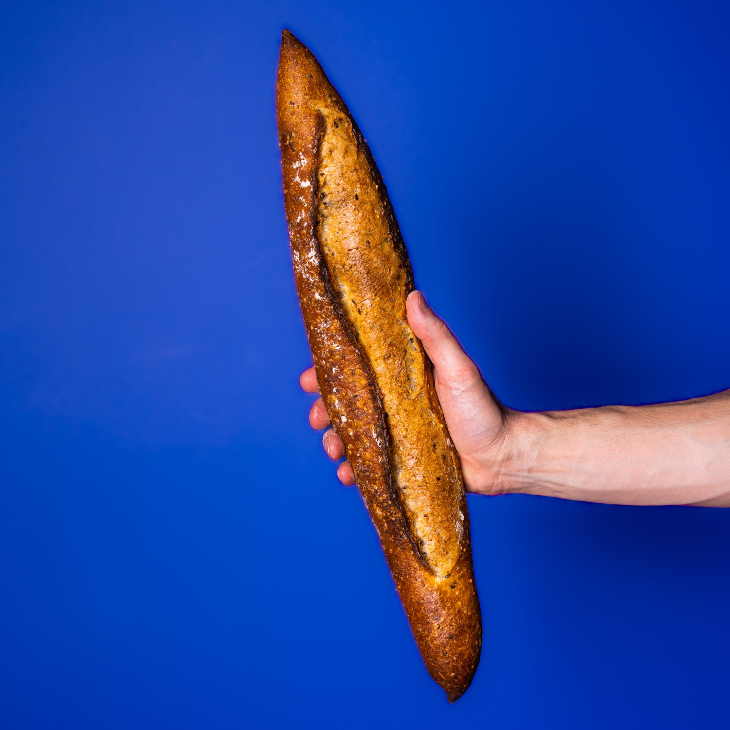 Baguette aux graines : avec levain liquide 25% et farine de blé 100%.