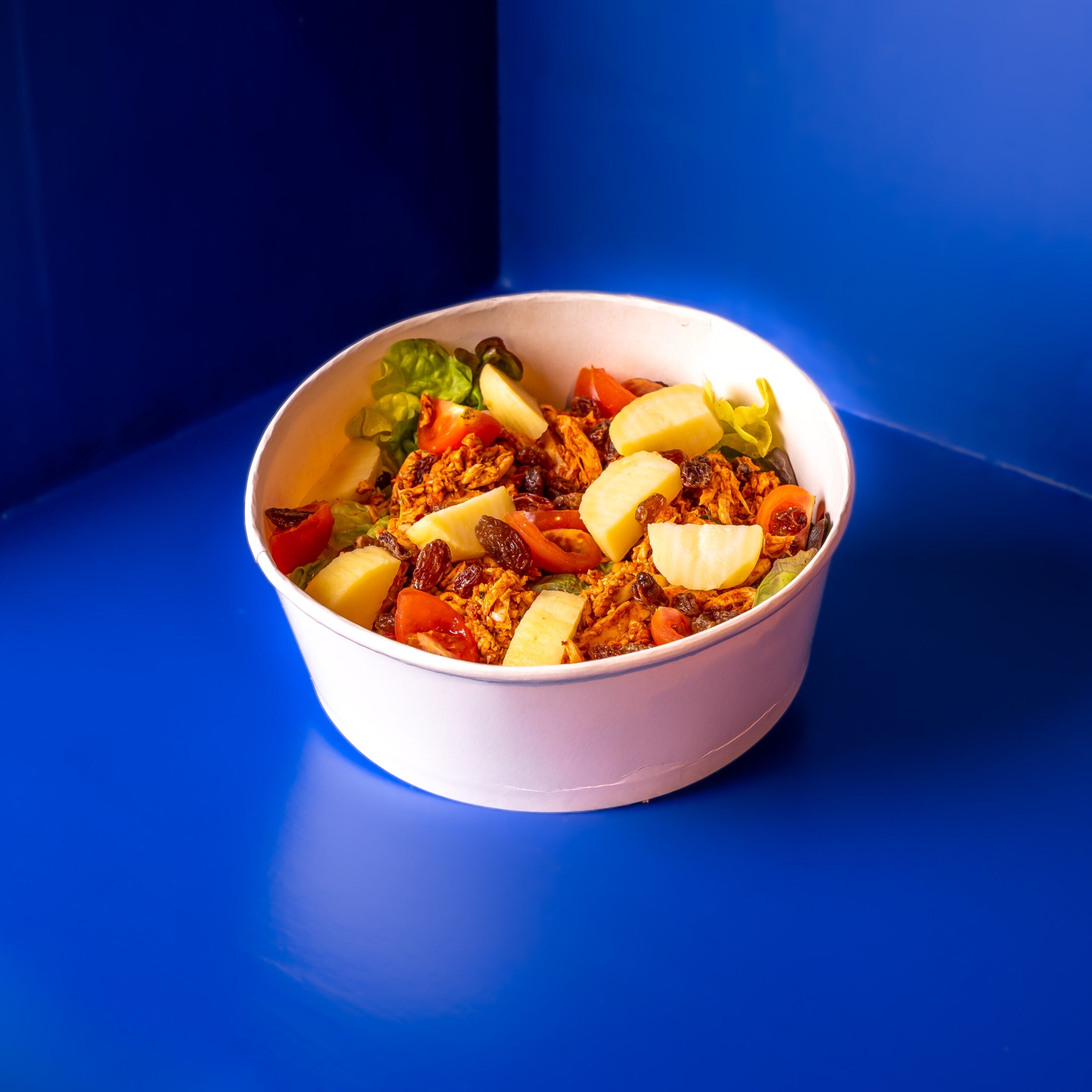 Salade de poulet épicé : une harmonie de saveurs créée par du poulet “tex-mex” légèrement épicé, des pommes de terre, des tomates et des raisins secs, le tout sur un lit de salade de feuilles de chêne.